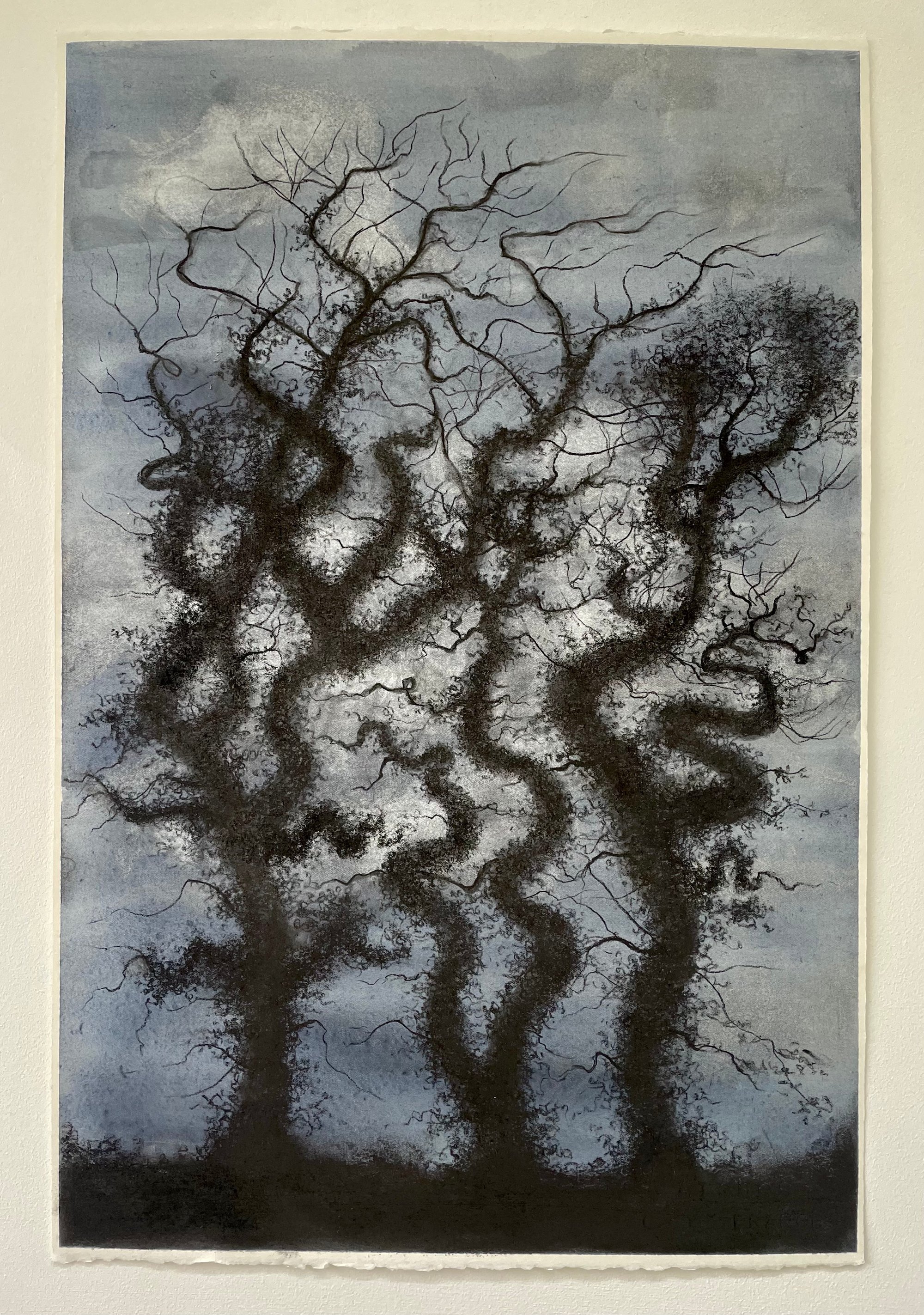 Some Cornish trees, so contorted by the strong wind they resemble snakes. A charcoal drawing on Arches paper painted that was primed with watercolour and distressed with a rag. Measuring 38 x 57 cm unframed. Delivery is included in the price. All drawings sent recored and tracked.